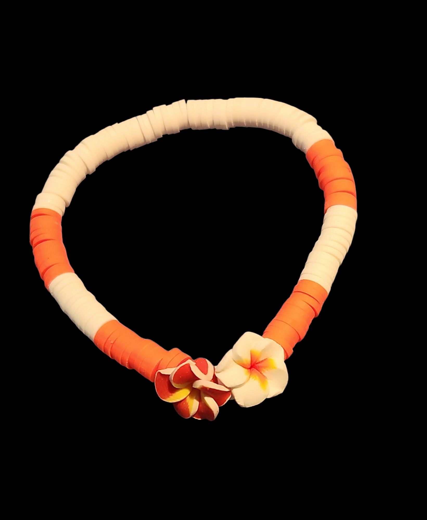 The bracelet features hibiscus flower shaped beads made of polymer clay sculpted to resemble the petals of a hibiscus flower. Accenting the flowers are orange and white disc shaped clay beads. The beads are strung on elastic cord to make it easy to put on and off your wrist.