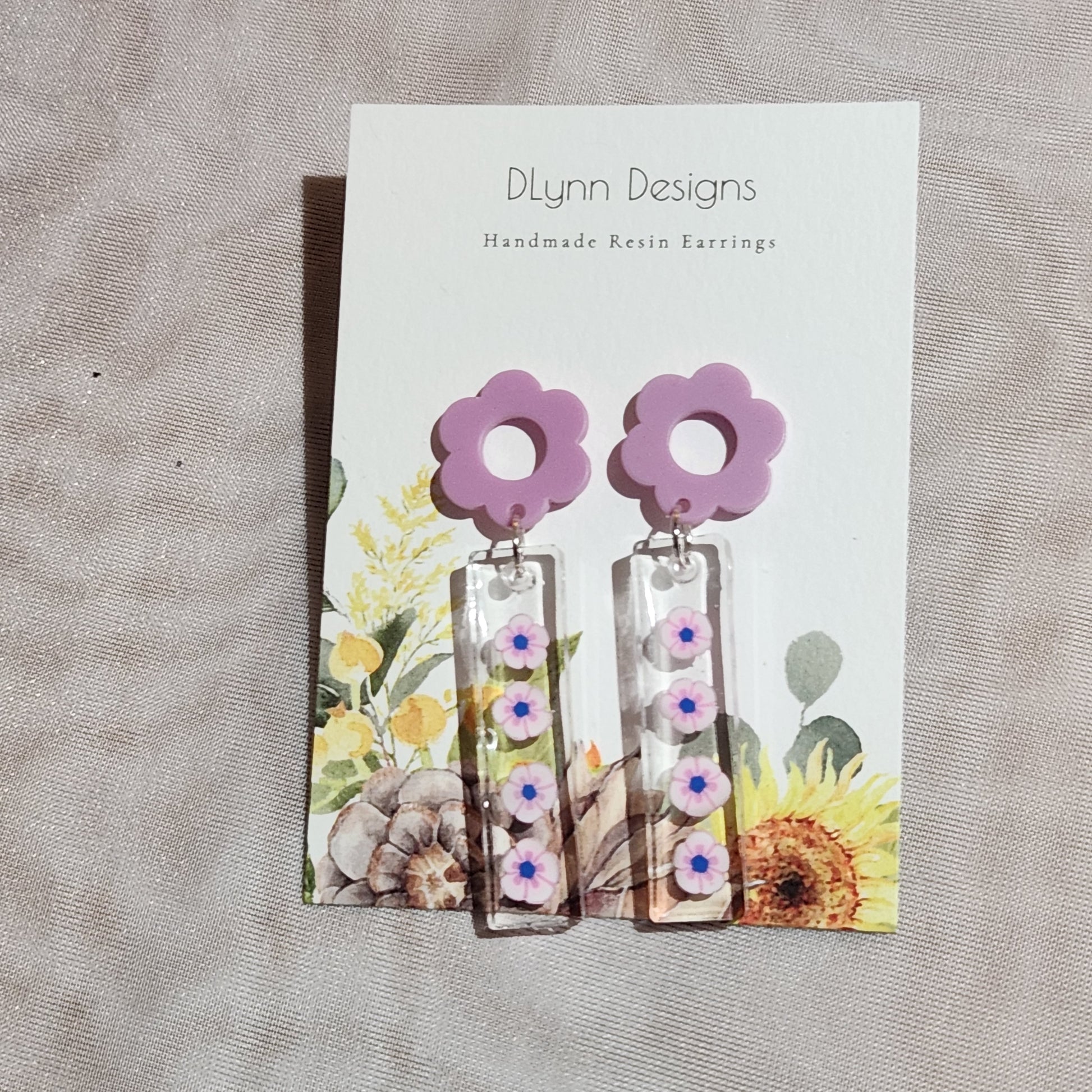 The acrylic lavender flowers sit above resin dangles filled with matching flowers.