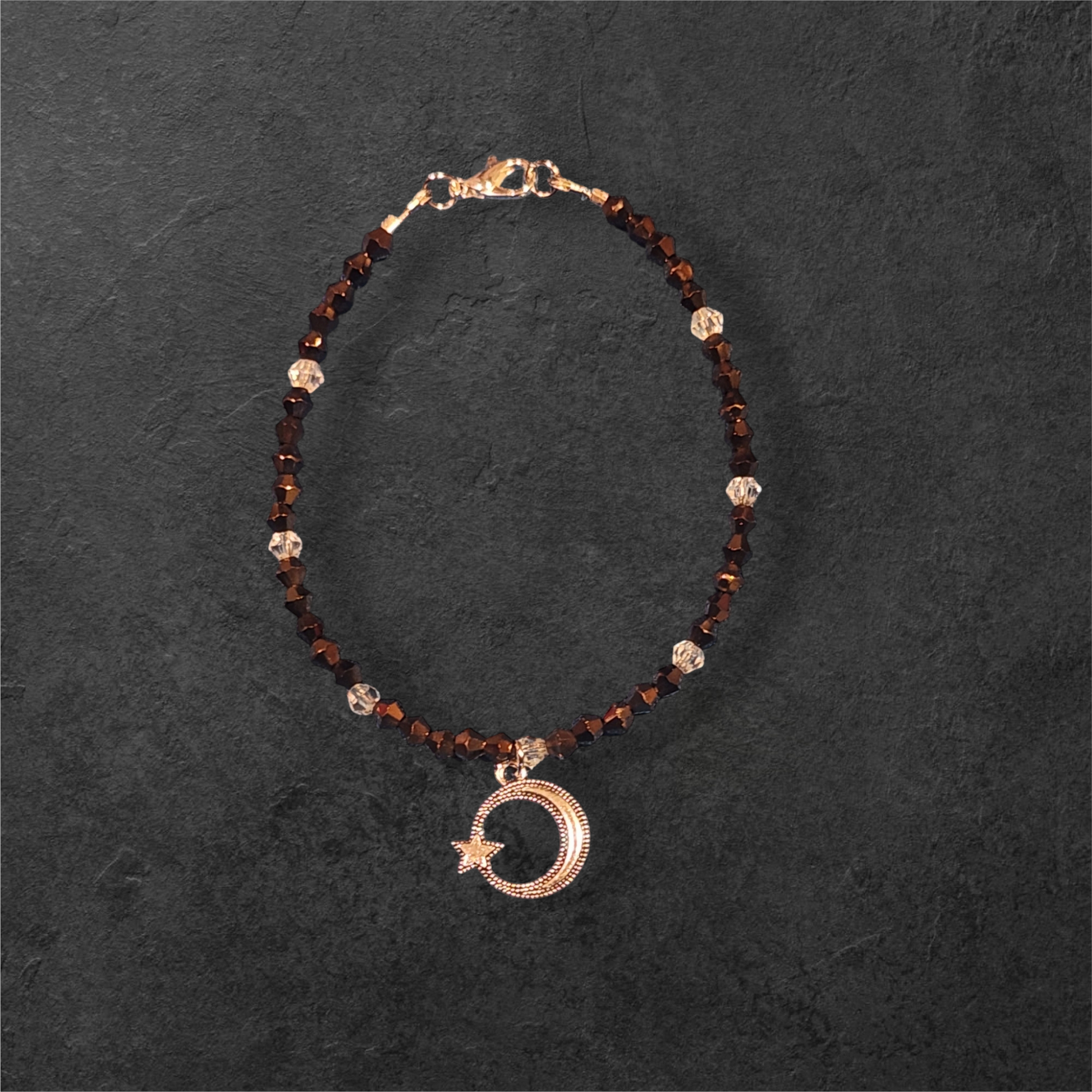 This bracelet is made with dark brown crystal bicone beads, clear round crystal beads and a moon and star charm.