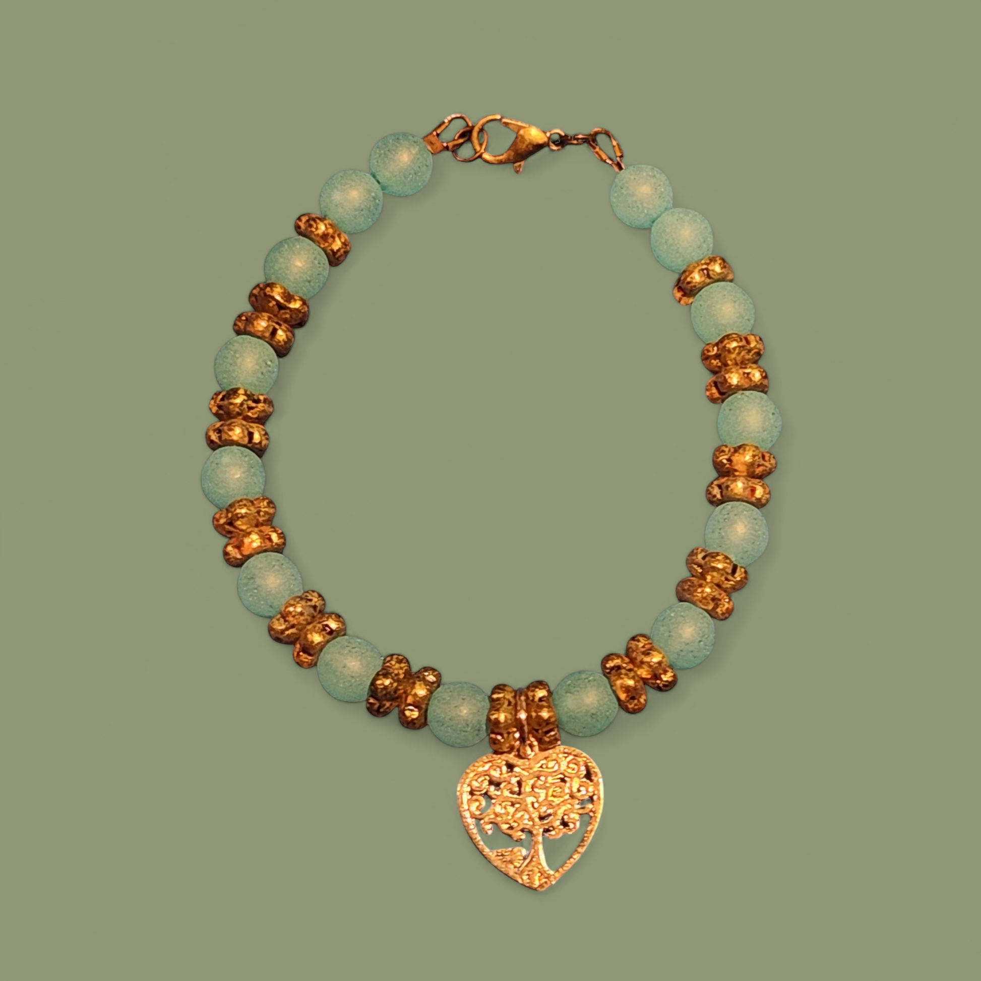 This bracelet is made with turquoise-colored beads and bronze-colored spacers. It is adorned with a tree of life charm.
